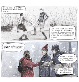 Dopo averci raccontato di Maradona, il fumettista a tutto tondo Paolo Castaldi vuole capire da dove sia venuto fuori un personaggio così particolare, uno svedese che apparentemente rappresenta l’integrazione di successo in un paese che per noi della povera Europa di serie B è un ideale di stabilità economica e welfare (e la cosa ci ha fatto ancora di più arrabbiare per la recente eliminazione dalla fase finale dei mondiali). Ma non tutto è oro quel che luccica e lo stesso essere fuori dalle righe di Ibrahimovic ha spinto evidentemente Castaldi a cercare di capire di più l’uomo dietro al calciatore. E quello che leggiamo è proprio la ricerca di Castaldi che è anche personaggio e protagonista del racconto nel ruolo di reporter in Svezia e in particolare a Rosengård. Il sottotitolo forse più indicato per capire il fumetto è ‘un italiano a Malmö’!