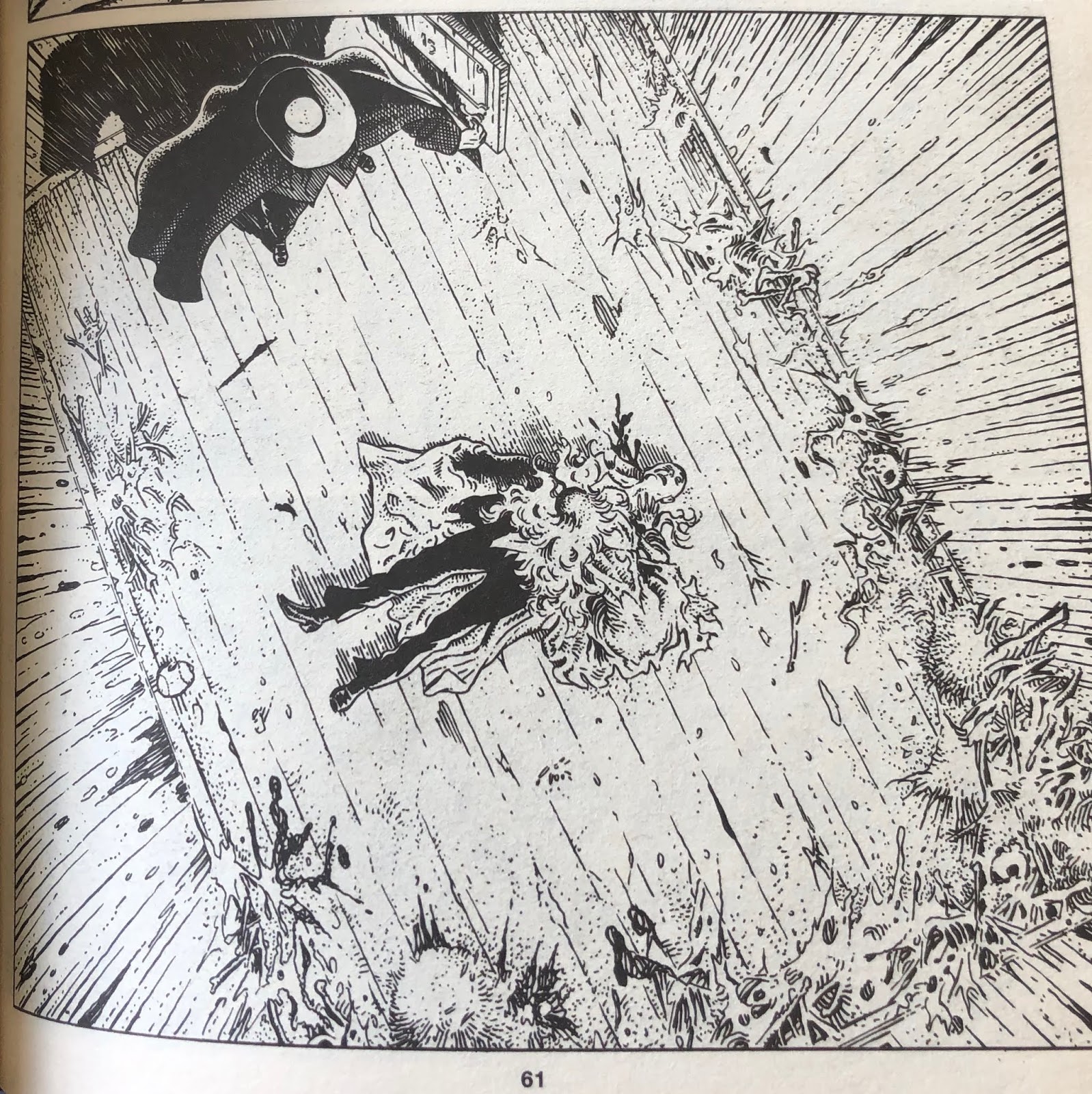 p.44 Torricelli dimostra una notevole abilità nel rappresentare le scene di pioggia. Il vertice e nella vignetta lunga in posizione 3-4: sull’esterno buio della casa dove alloggia Astrid, la sagoma del demone-famiglio emerge dalle tenebre solo grazie al diverso cadere delle gocce. Bellissimo e intenso il volto di Harlan a chiusura della medesima tavola;