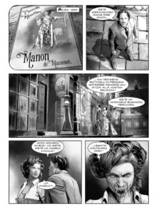 La storia di Barbieri è, infatti, solida e si inserisce in un genere di racconto che ha tanti precedenti in Dampyr: un non-morto creato da un maestro della notte e rimasto a spadroneggiare in un certo luogo tanto da diventare una sorta di genius loci. In questo caso è la bellissima e affascinante Camille Monfort (caratterizzata benissimo da Andrea Del Campo) che da regina dell’Opera cede al desiderio della eterna giovinezza e attraversa i decenni in un clima di decadenza e languore che è amplificato dalle belle mezzetinte di Del Campo. Barbieri che mostra di sapersi da subito muovere con i personaggi dampyriani inserisce su questa trama-base alcuni elementi narrativi che meritano attenzione. La bella Camille non è la vera antagonista di Harlan e soci, e anzi si rivela decisiva a salvarli, ma tutto questo non la rende una nuova alleata dei nostri eroi. La sua fine è sia una liberazione sia un ultimo canto come quello di una protagonista tragica del melodramma. Inoltre assistiamo ad un moltiplicarsi di contesti di decadenza e fallimento: la fugace stagione di fine ottocento con il sogno di civilizzare ed europeizzare l’Amazzonia e l’utopia destinata all’oblio di Fordlandia (come di Brasilia del resto).